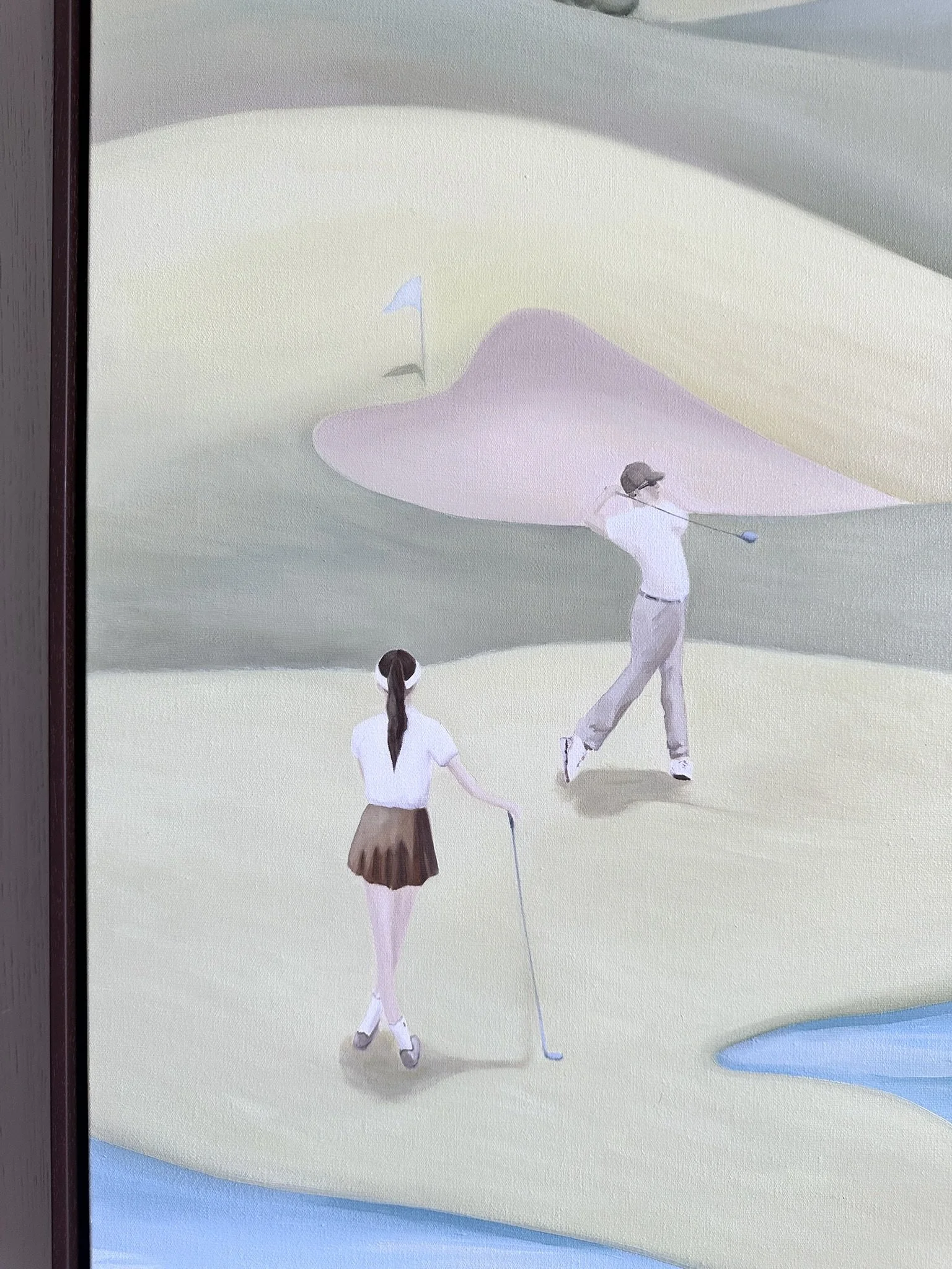golf fields A commissioned artwork of golf fields. A couple playing golf under the dreamy pink sky, capturing both the serenity of the sport and the essence of quality time outdoorsOriginal artwork / oil on canvas / 90x150cm contact for commissions go back
